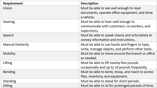 - Performs new hire employee orientations, acting as an information resource for employees regarding personnel policies, payroll, benefits, and employment opportunities within the bank.
